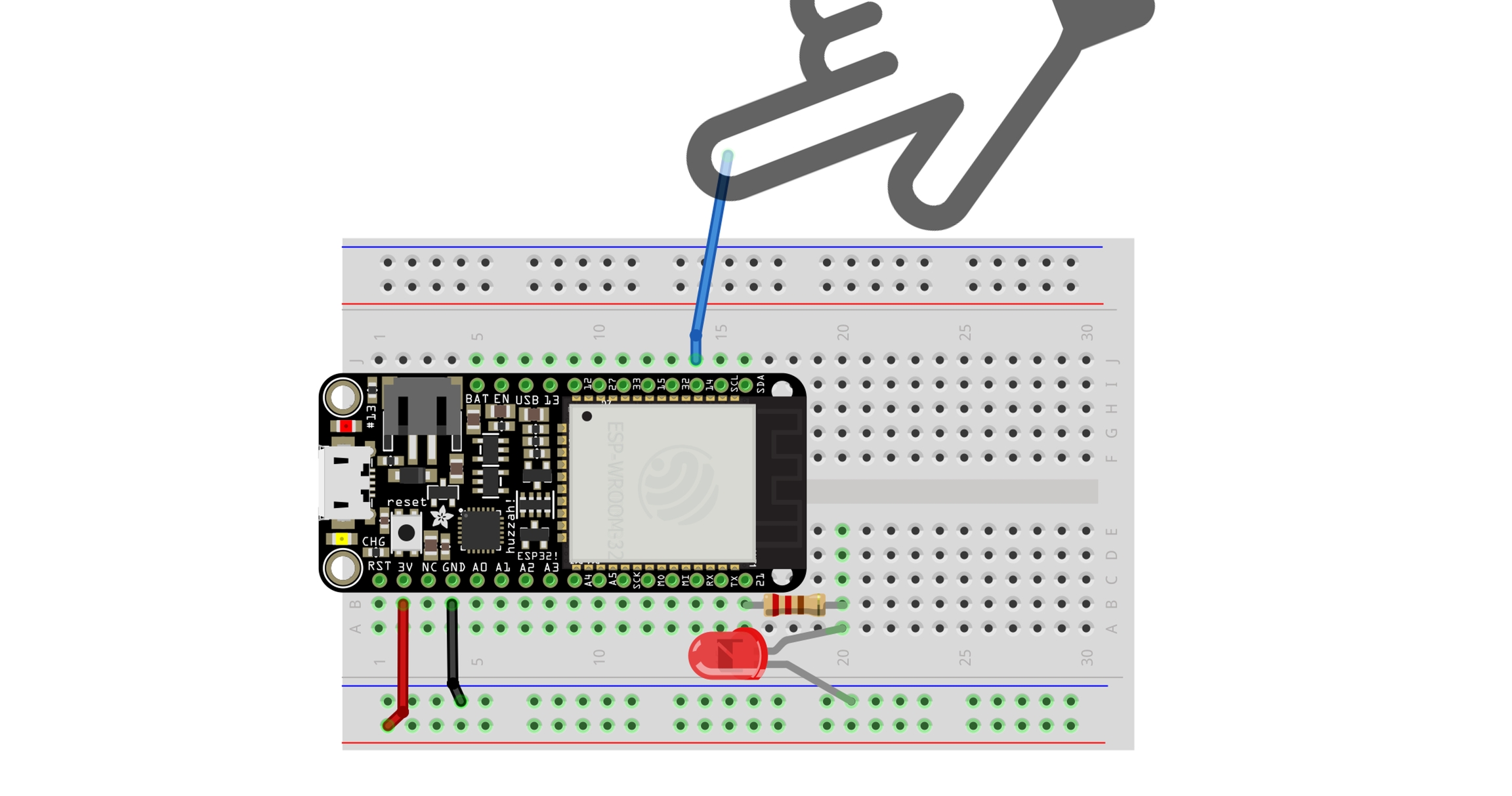 Tal y como se muestra en la siguiente figura, la capa conductora actúa como un potenciómetro con C como control deslizante. Si el dispositivo que mide el voltaje en C tiene una impedancia de entrada muy alta, entonces se puede ignorar la resistencia de la pista desde la superficie hasta el terminal C. Como la mayoría de los microcontroladores tiene un conversor analógo a digital con una alta resistencia de entrada (normalmente varios MΩ); entonces, el voltaje en C estará entre 0 y 5 V en proporción directa a la distancia de A del toque. La siguiente figura muestra esto:
